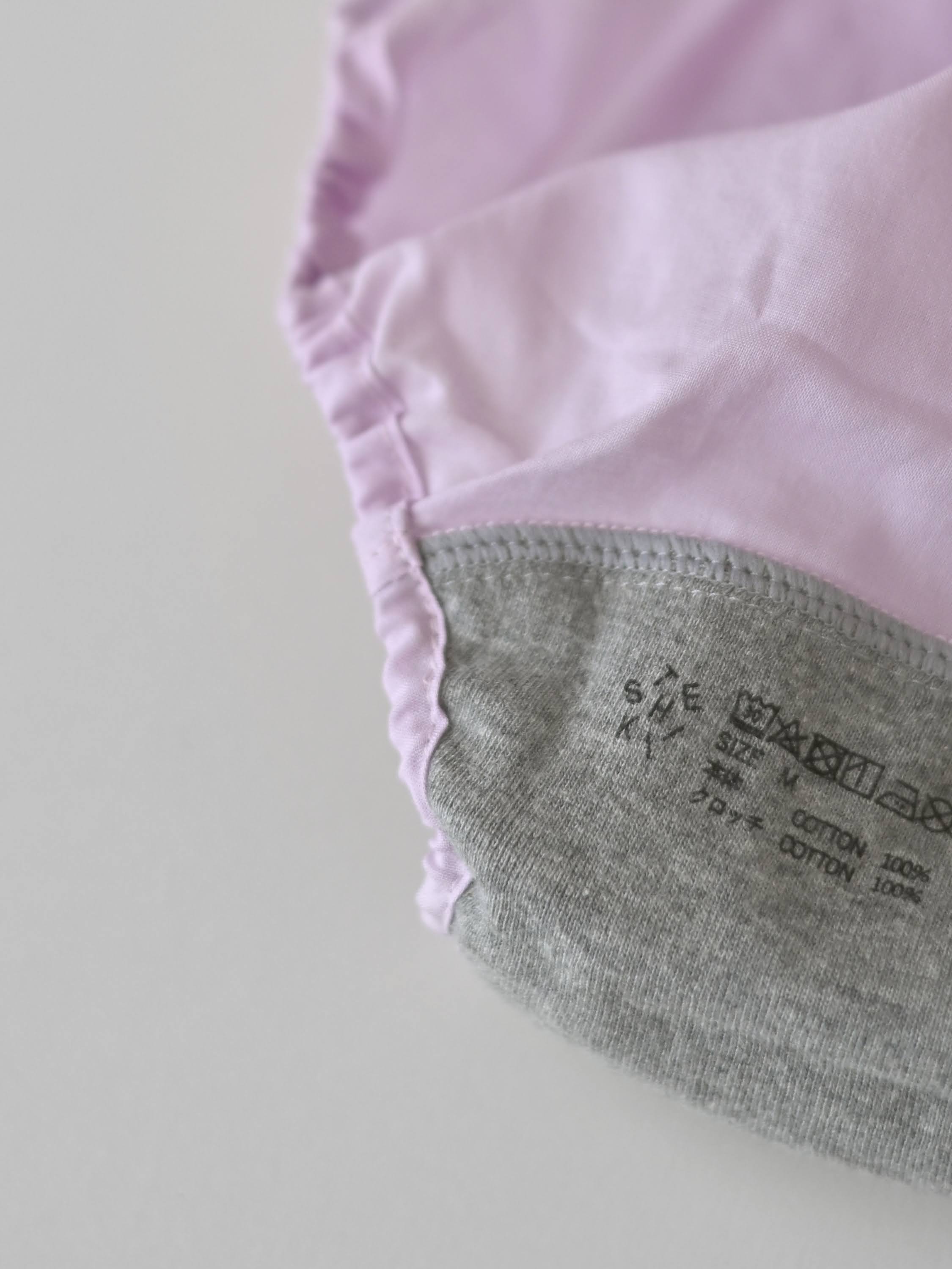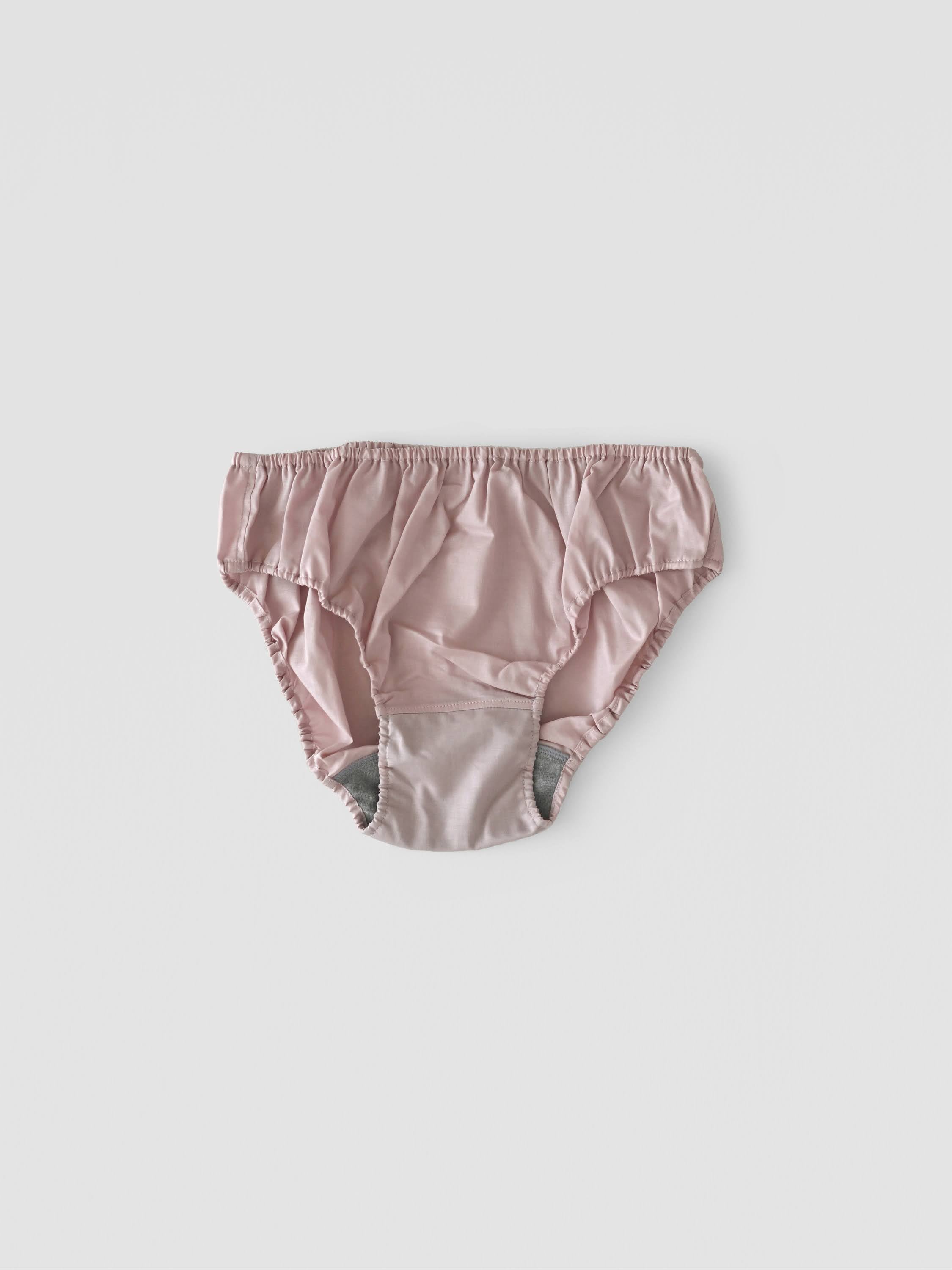 ウエストと足ぐりにゴムを入れ、ふんわりと支える設計。ゴムは縫い代の中に隠れていて、肌に直接あたらない