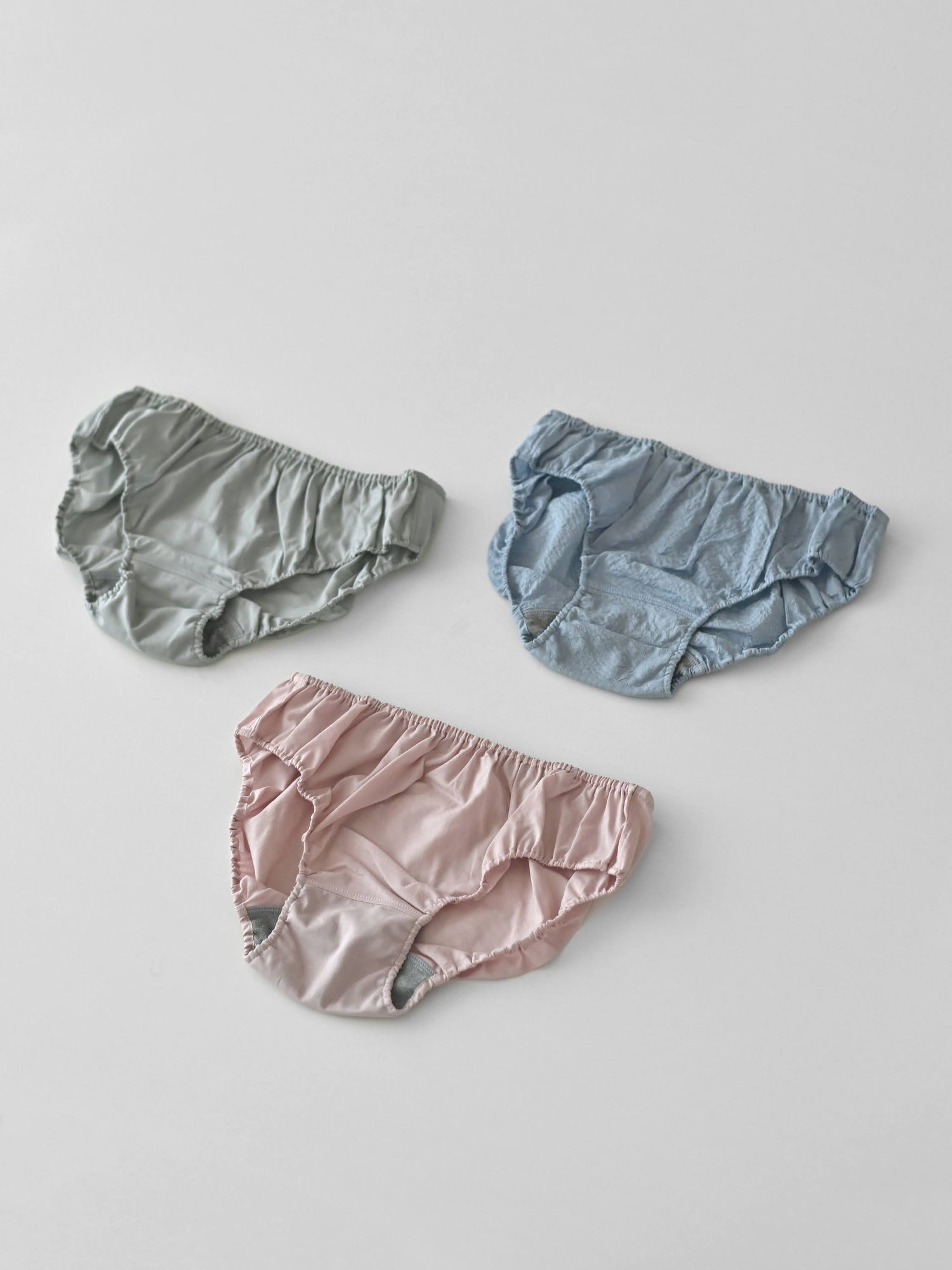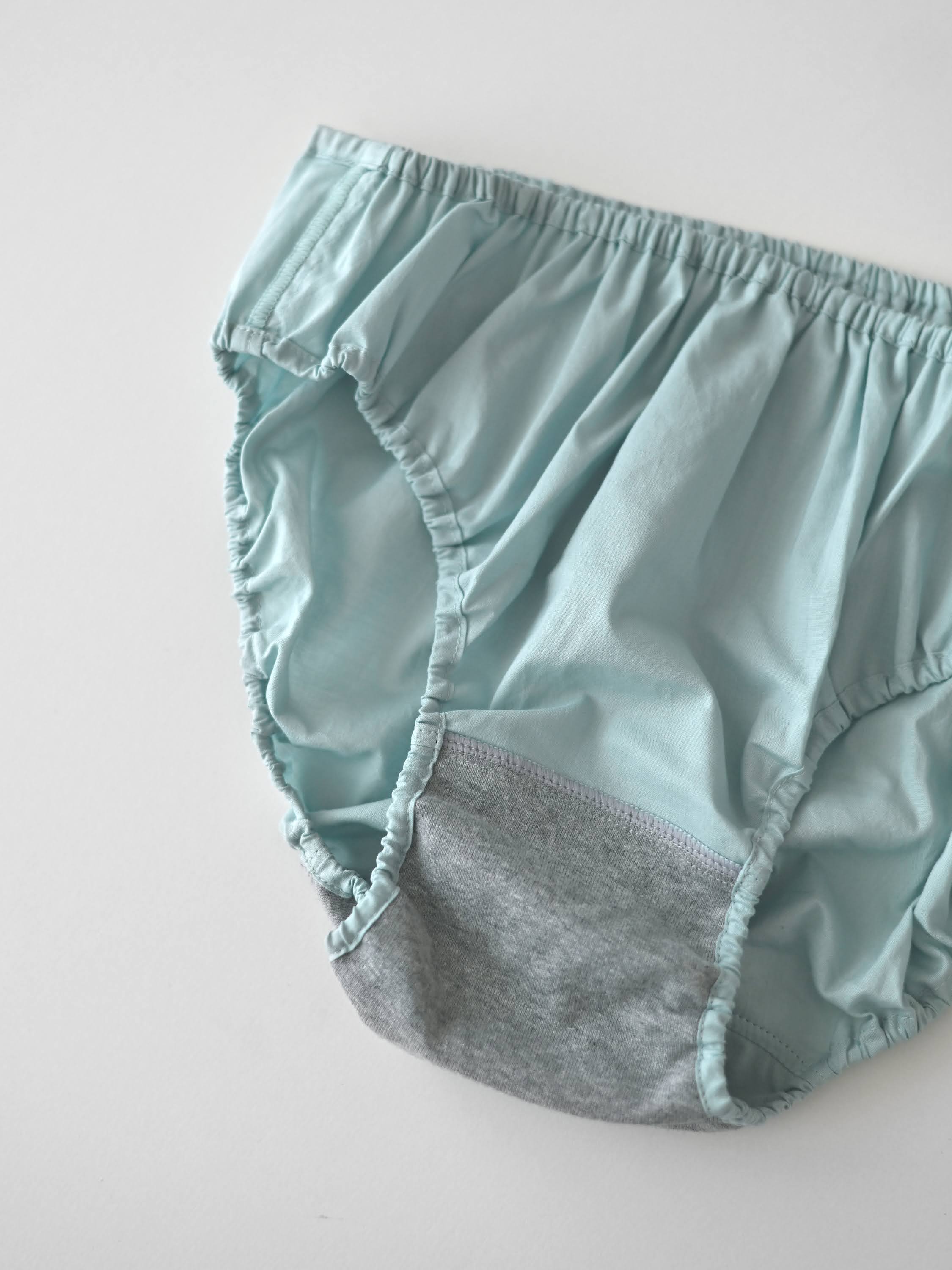 ウエストと足ぐりにゴムを入れ、ふんわりと支える設計。ゴムは縫い代の中に隠れていて、肌に直接あたらない