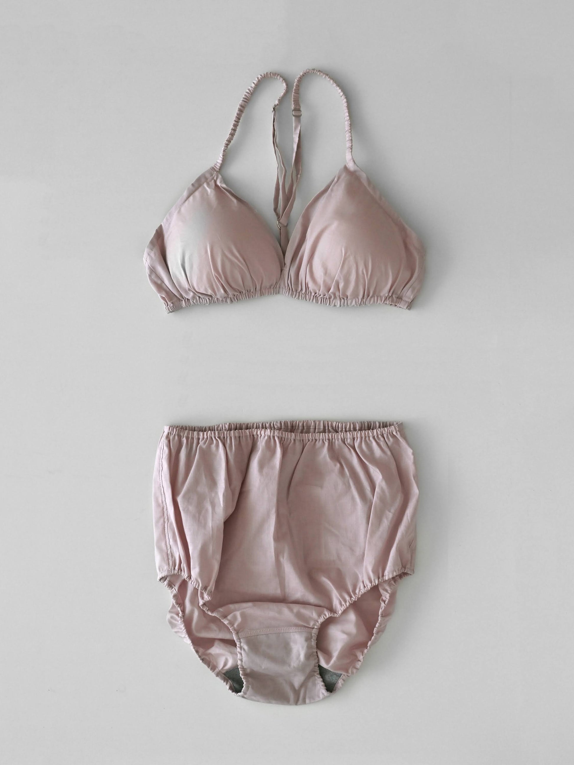 肌馴染みの良い、スモーキーピンクのBRAとPANTS。