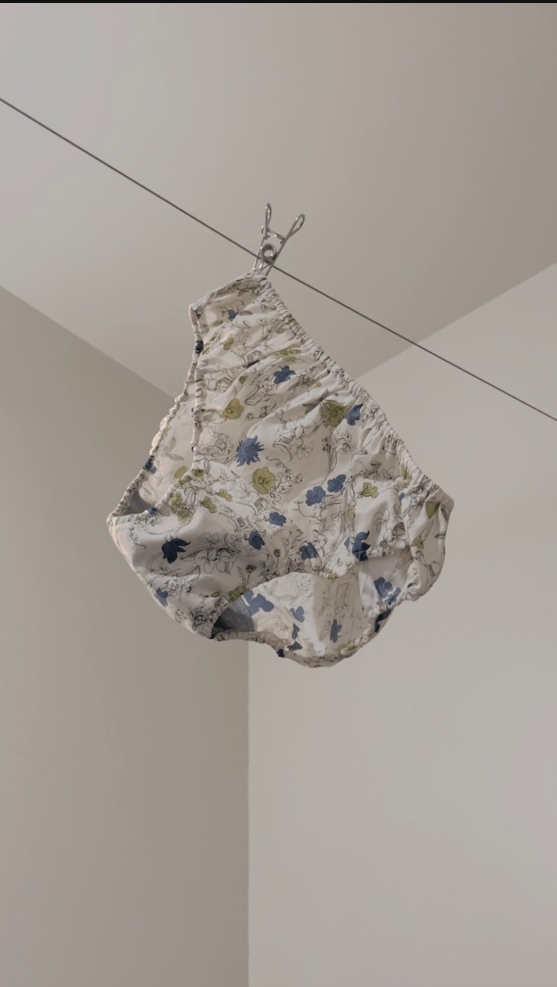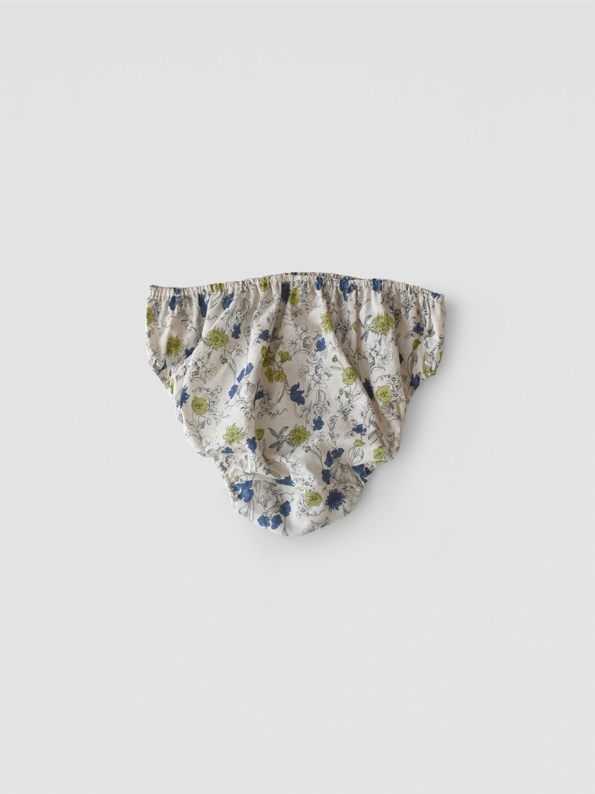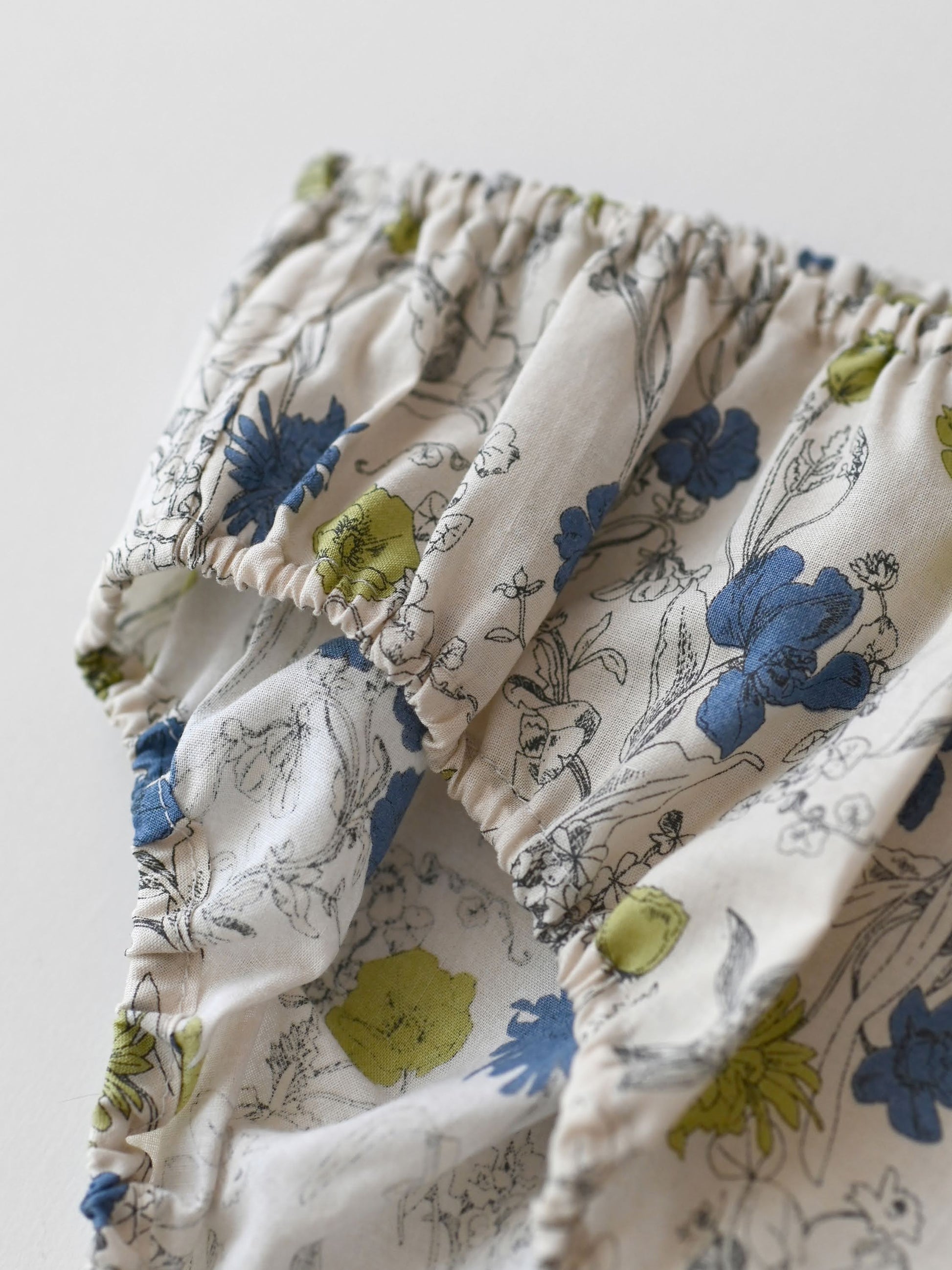 生成ベージュベースカラーに、落ち着いたライムとラピスラズリ色の美しい花柄のPANTSです。