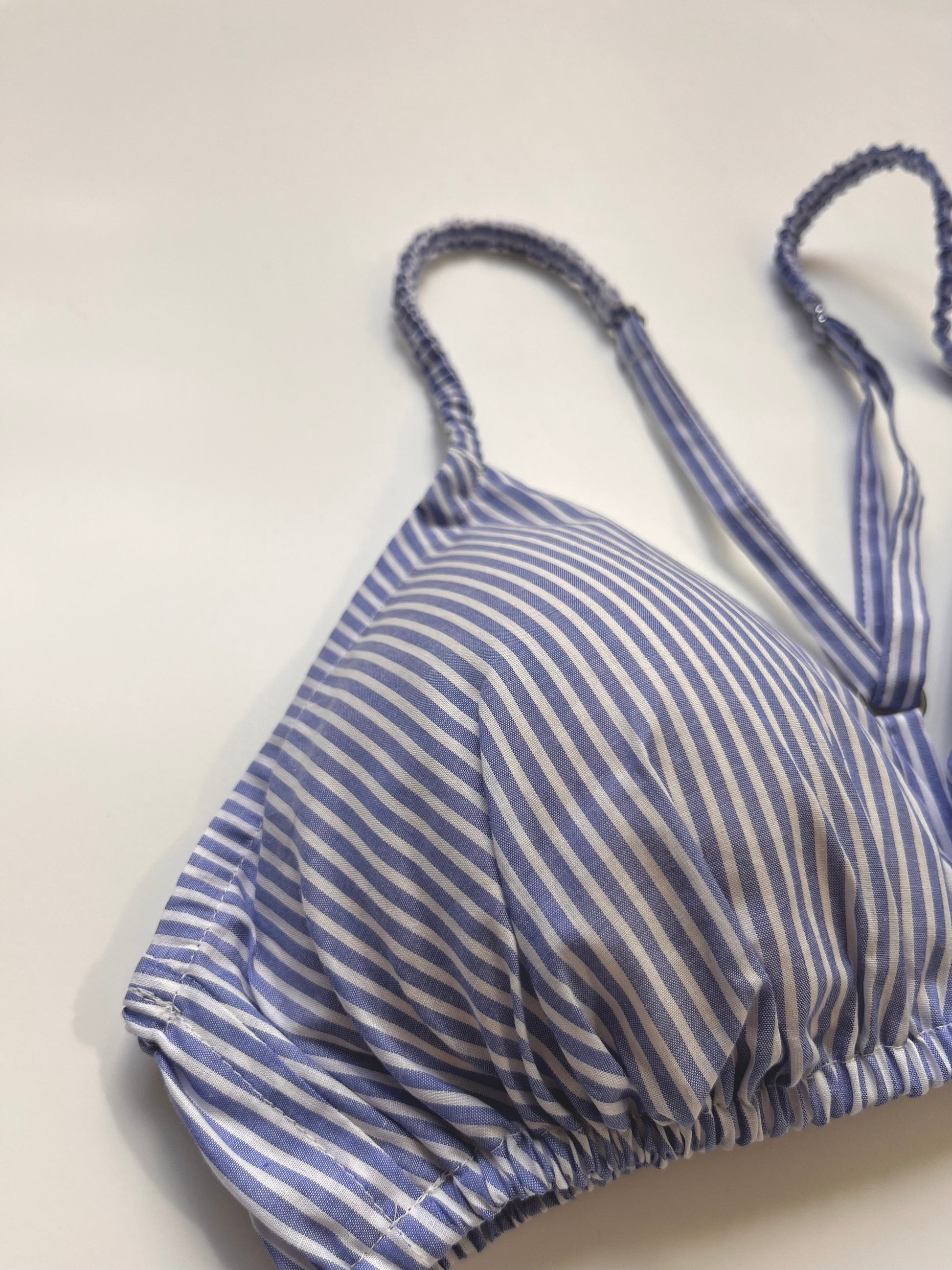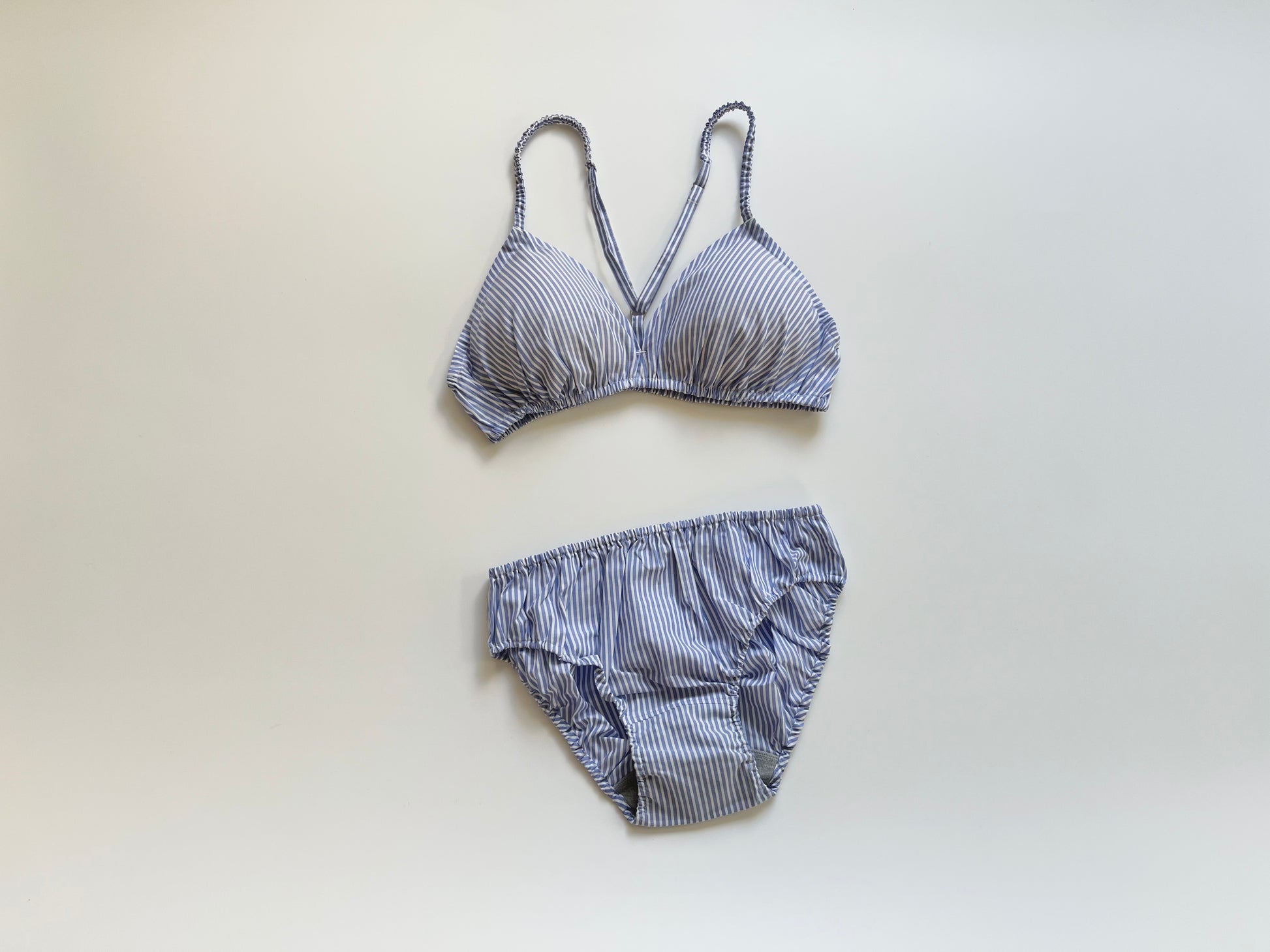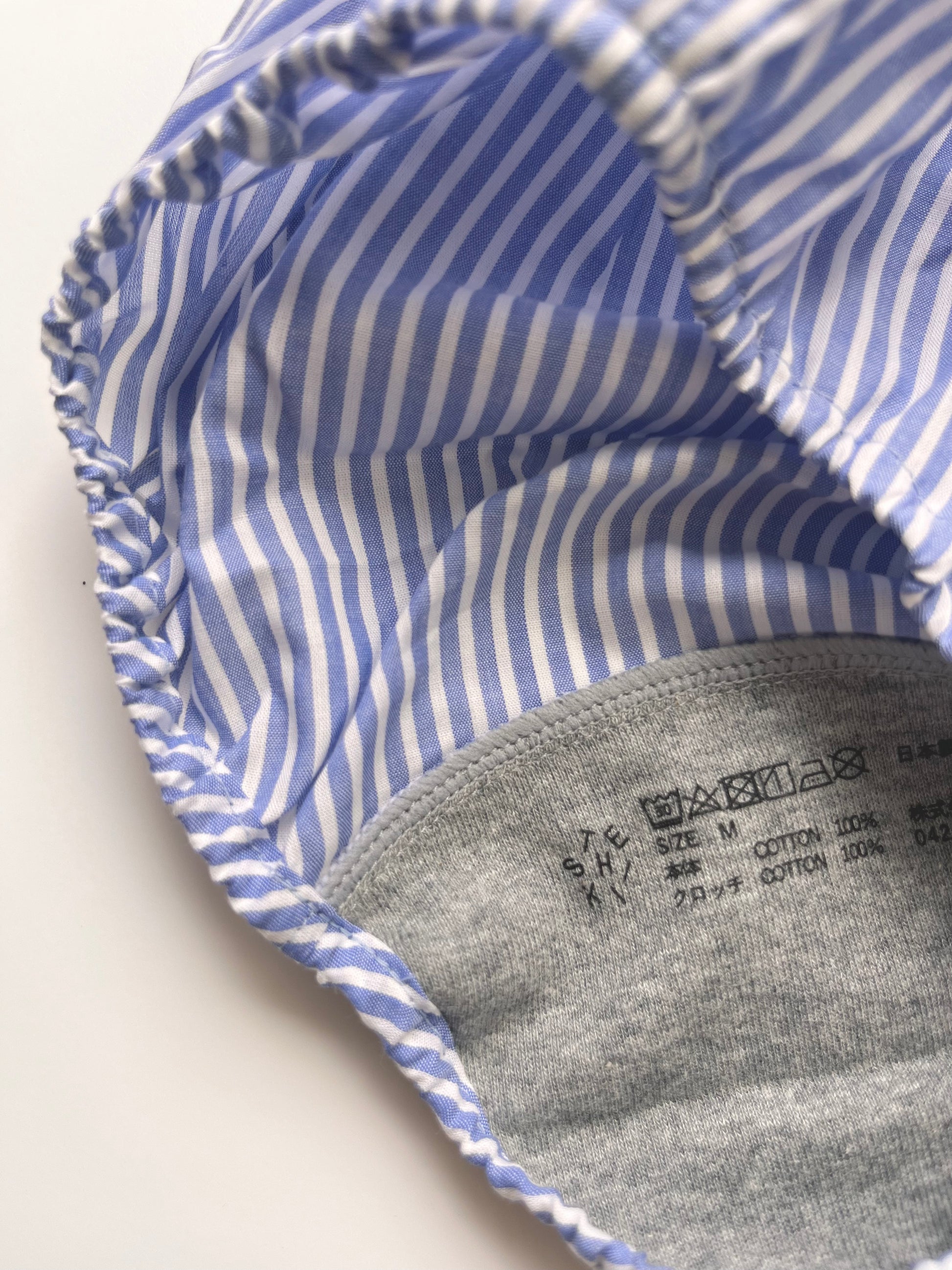 このストライプの柄は、着用すると気分がシャープになるような感じがしてとても気に入ってます。ブラの柄物(水玉やストライプ)がとても可愛いくて好きなので、バリエーション(チェックやお花柄など)が増えると良いですね。サイズは普通体型で、最初に購入するときに相談にのっていただいて、それ以来Mで問題ないですね。(Lも1つ持ってますが出番はあまりないです)裁縫はとっても丁寧で丈夫ですが、パッドを買い直したり、フックの部分をお修理出させてもらったりして、長く愛用できるのが嬉しいです。先日二週間海外旅行したい際にも持って行きましたが、ホテルの洗面で手洗いでサクッと洗えて割りにすぐ乾くので重宝しました。