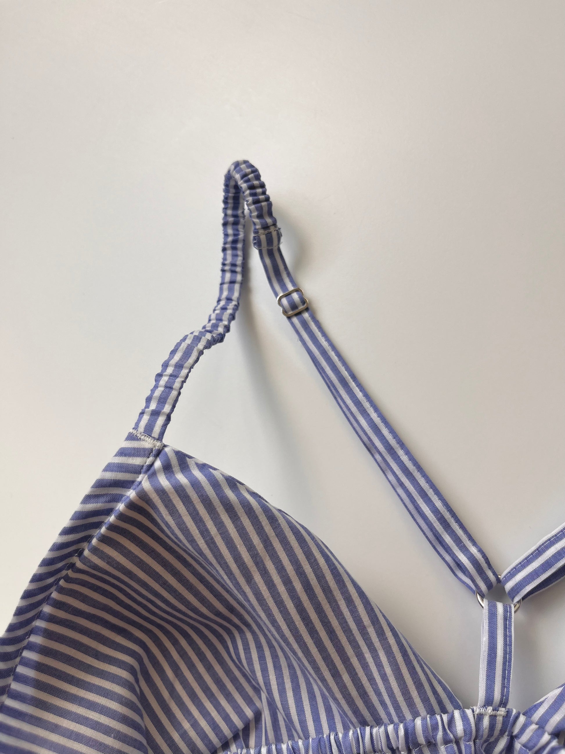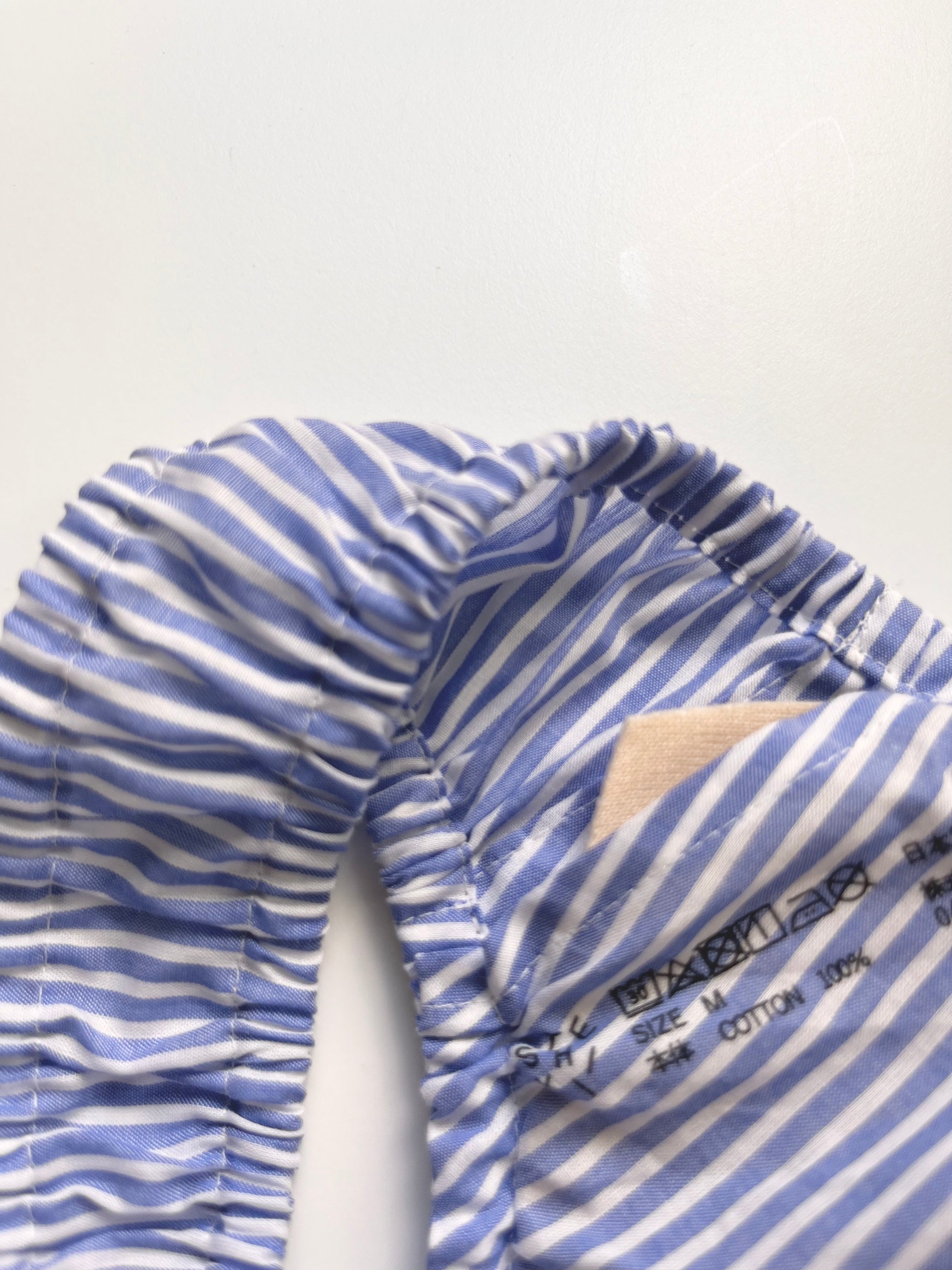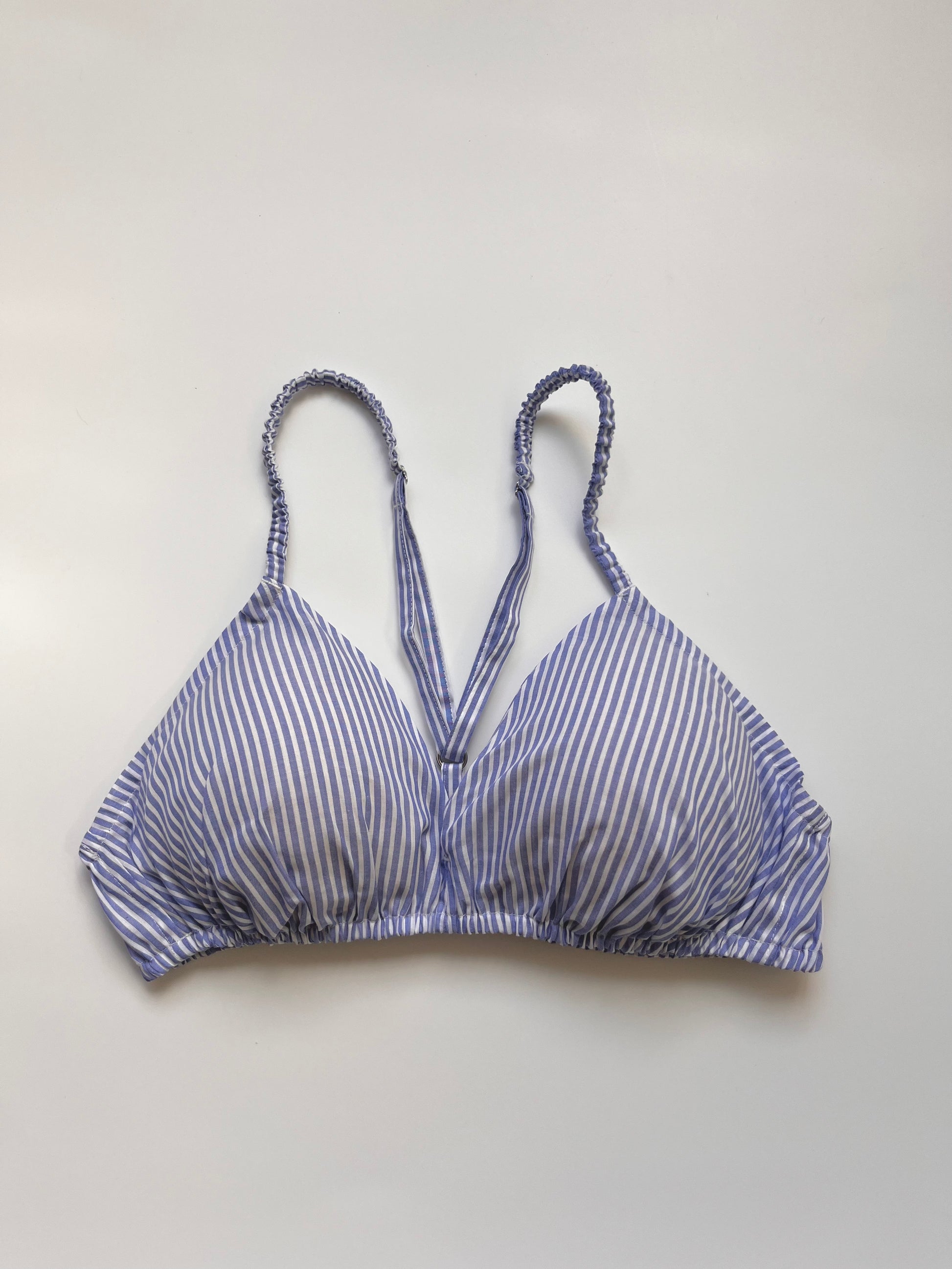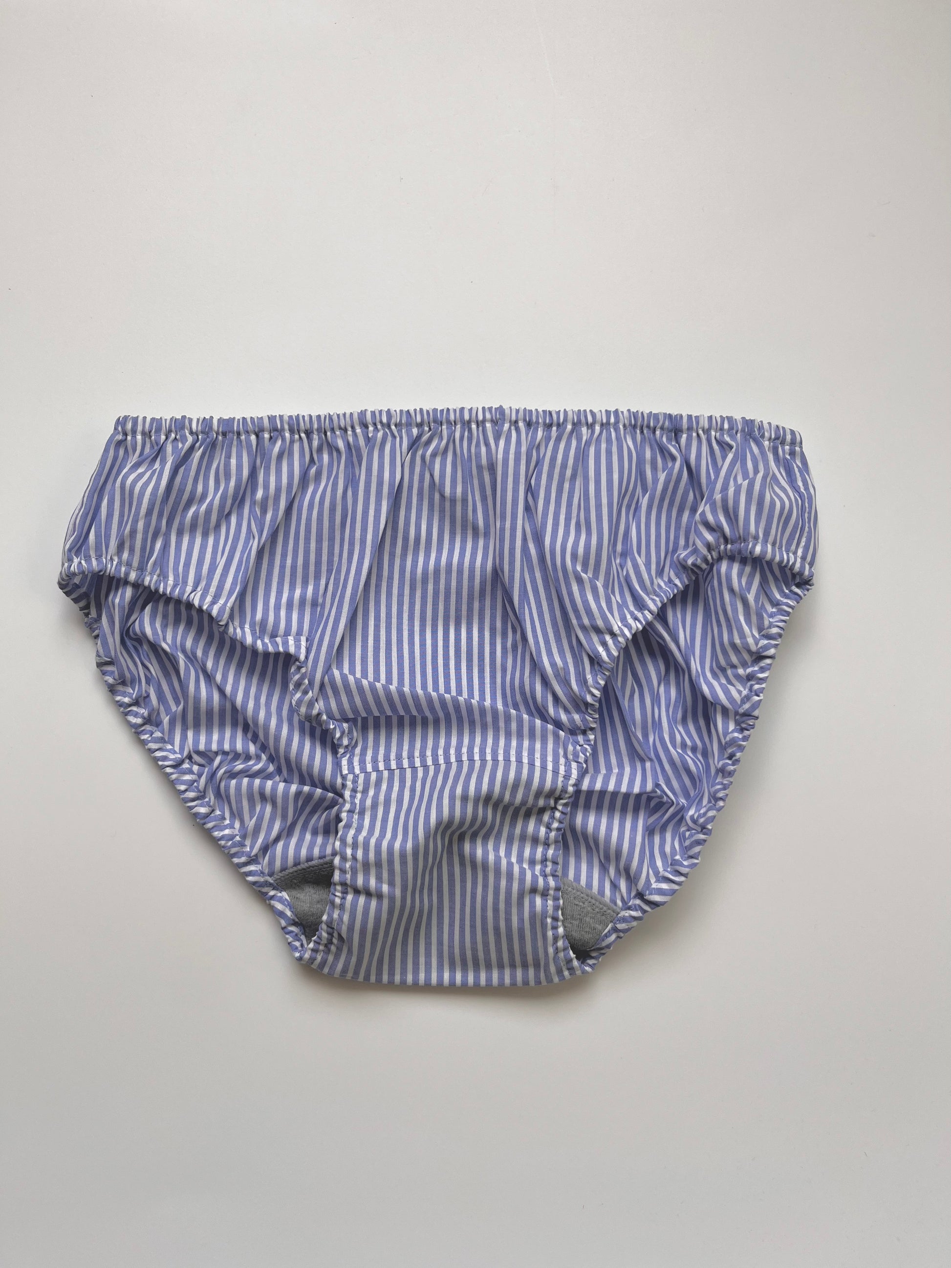 このストライプの柄は、着用すると気分がシャープになるような感じがしてとても気に入ってます。ブラの柄物(水玉やストライプ)がとても可愛いくて好きなので、バリエーション(チェックやお花柄など)が増えると良いですね。サイズは普通体型で、最初に購入するときに相談にのっていただいて、それ以来Mで問題ないですね。(Lも1つ持ってますが出番はあまりないです)裁縫はとっても丁寧で丈夫ですが、パッドを買い直したり、フックの部分をお修理出させてもらったりして、長く愛用できるのが嬉しいです。先日二週間海外旅行したい際にも持って行きましたが、ホテルの洗面で手洗いでサクッと洗えて割りにすぐ乾くので重宝しました。